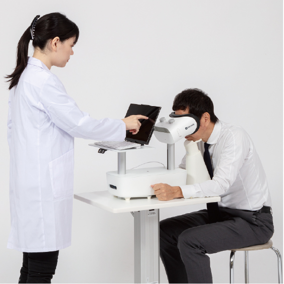 従来のimo(ヘッドマウント型)と異なり、改良版は覗き込むタイプの視野検査計となります。また従来のものと同様に、暗室環境は不要です。そのため暗く狭い環境が苦手な患者様や、車いすなど移動が難しい患者様も検査での負担が軽減できるようになっています。